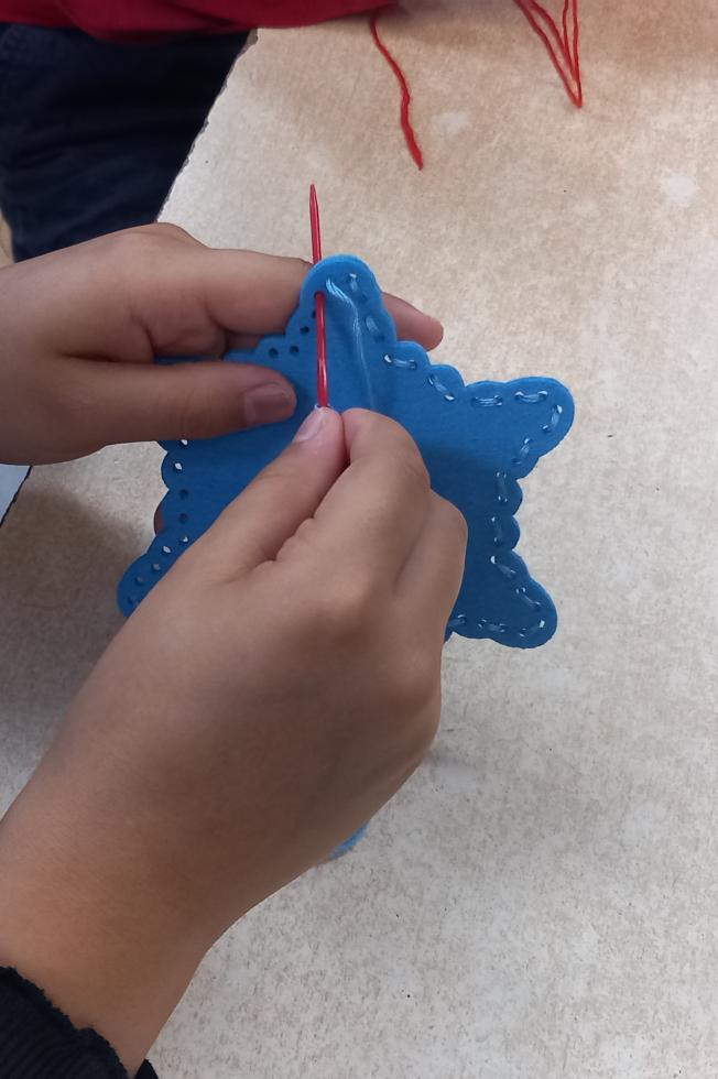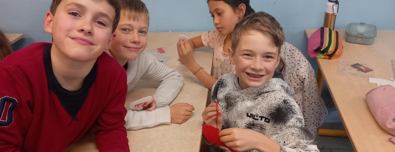 Les élèves de P4 participent à des ateliers couture où ils découvrent les bases de la couture. Après avoir appris à enfiler une aiguille et à réaliser quelques points simples, ils confectionnent chacun des petites pièces.