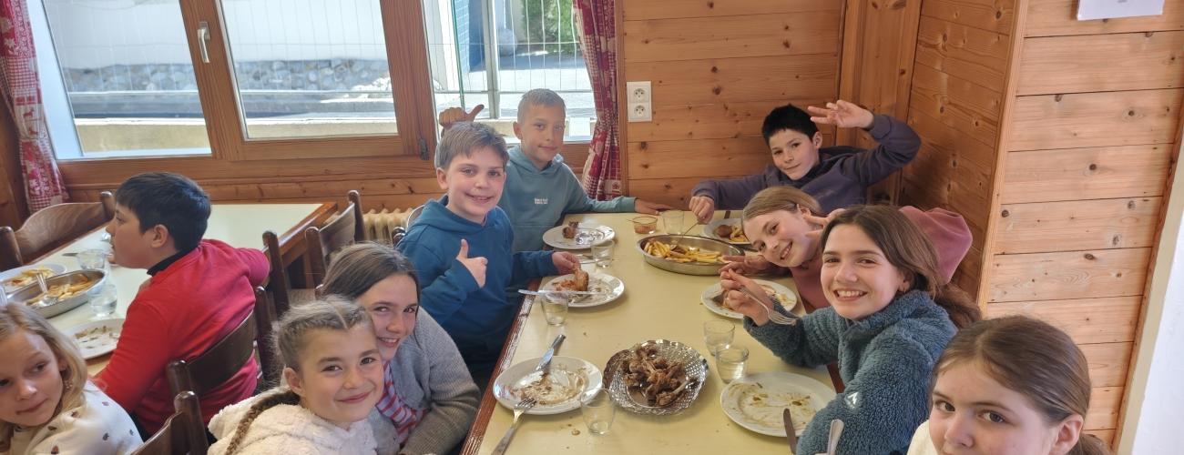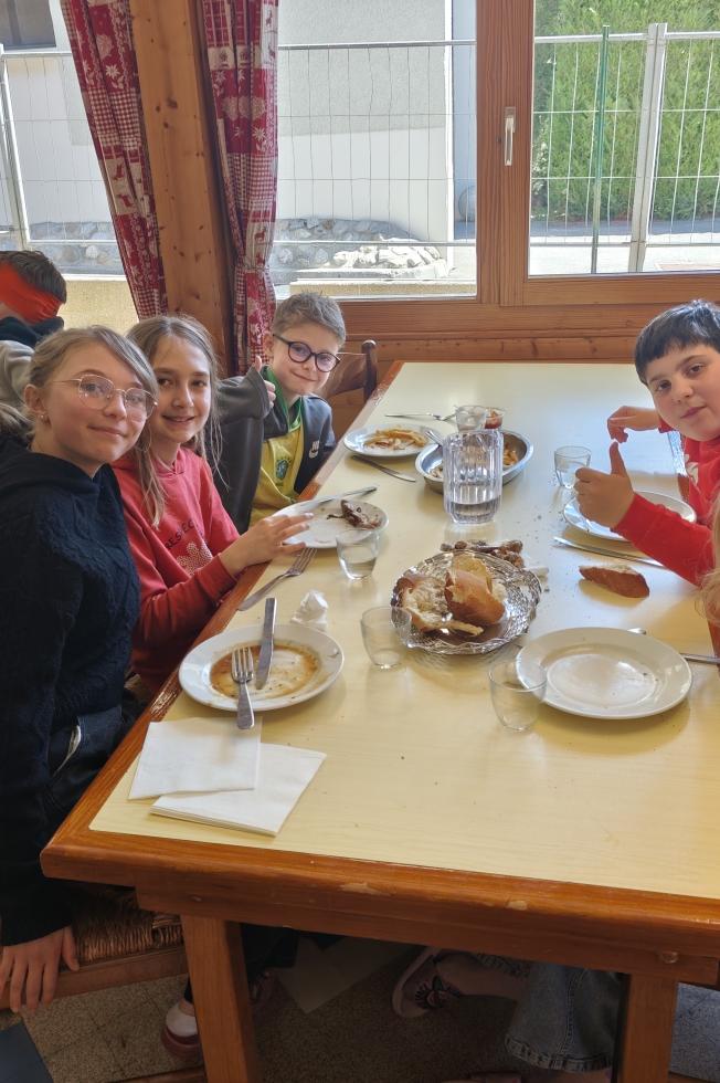 La deuxième journée de notre aventure à la montagne s'est déroulée sous un ciel d'un bleu éclatant, nous offrant un dimanche comme on en voudrait tant. Dès le matin, l'effervescence est montée d'un cran lors de la rencontre tant attendue avec les moniteurs de l'ESF. Direction ensuite les magnifiques pistes de Pré-la-Joux pour chausser enfin les skis. Tandis que les débutants découvraient avec enthousiasme leurs premières sensations de glisse, les skieurs plus aguerris ont pu s'élancer sur des pentes plus techniques au cœur d'un paysage enneigé grandiose. La météo reste absolument exceptionnelle et, face aux températures clémentes et à la réverbération, la crème solaire est devenue notre meilleure alliée pour protéger les sourires de nos jeunes sportifs. C'est avec des souvenirs plein la tête et des couleurs plein les joues que cette journée parfaite s'achève par une animation, une raclette et quelques œufs. (Je vous rassure, aucun malade).